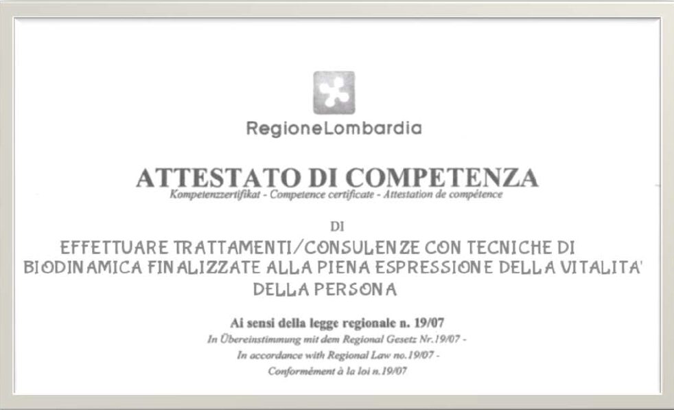La competenza certificata è: “Effettuare trattamenti – consulenze con tecniche di biodinamica finalizzati alla piena espressione della vitalità della persona” riportata nel Quadro Regionale degli Standard Professionali (QRSP) della Regione Lombardia nella sezione competenze Libere e Indipendenti.