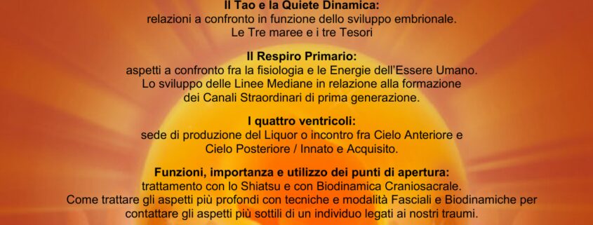 Durante il seminario verranno comparate le diverse visioni sullo stesso tema, quello del’incarnazione dal Cielo Anteriore al Cielo Posteriore mettendo a confronto i principi dell’embriologia a indirizzo Biodinamico con quelli del Taoismo inerenti lo stesso tema.